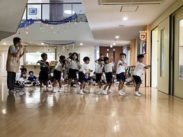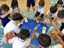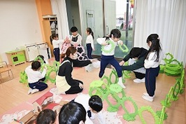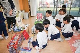 預かり保育室には専用の玩具や教材を配置し、預かり保育ならではの活動もあります。また、普段、接することの少ない異年齢の子どもと過ごすことで、通常の保育とは違った楽しさや新たな出会いがあります。